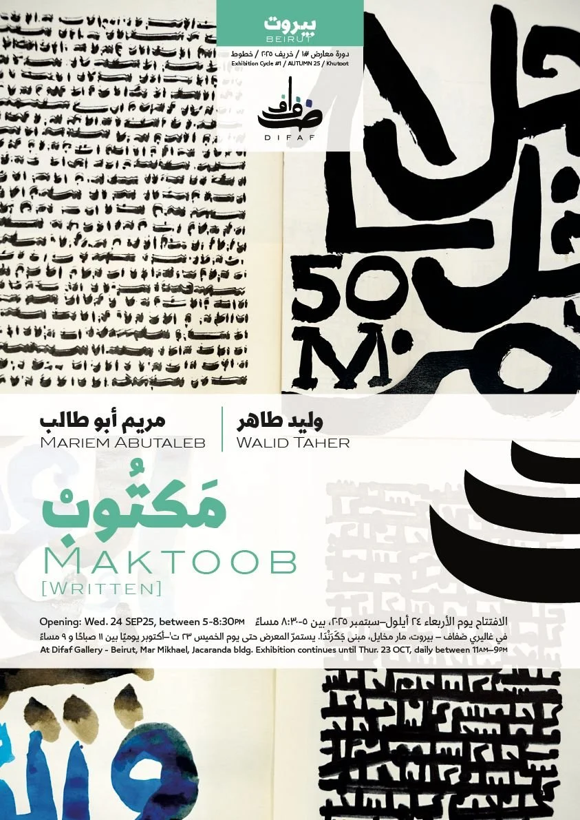 في هذا المعرض، يأخذنا وليد طاهر إلى الشارع، في رحلة لاستكشاف حضور الخطّ العفويّ في الحيّز العام. بينما تعيدنا مريم أبو طالب إلى حميمية الذات، مترجمة الخواطر إلى طلاسم مُركَّبة. بين الخارج المكشوف والداخل السرّي، تخاطبنا أعمالهما بصمت. نتساءل: هل هذا الخطّ الفاصل بين وليد ومريم هو سِتار، أم هو مرآة؟Signs and metaphors, clues and symbols.